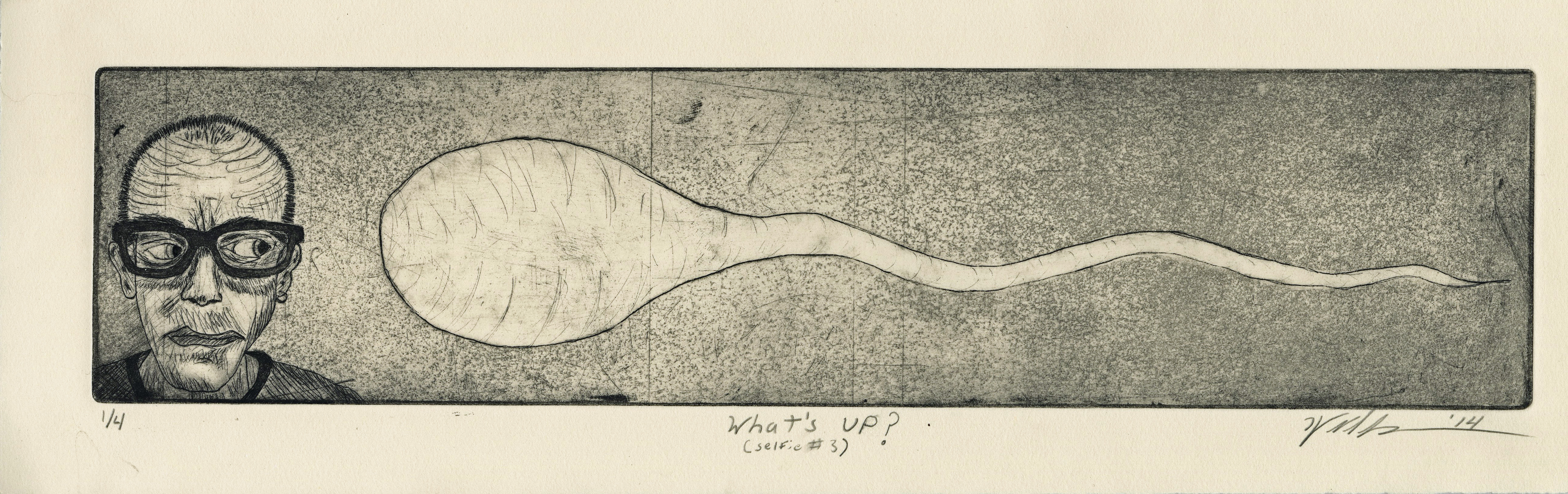 What’s Up? (from The Selfie Series), etching, 2″ x 10″, 2014