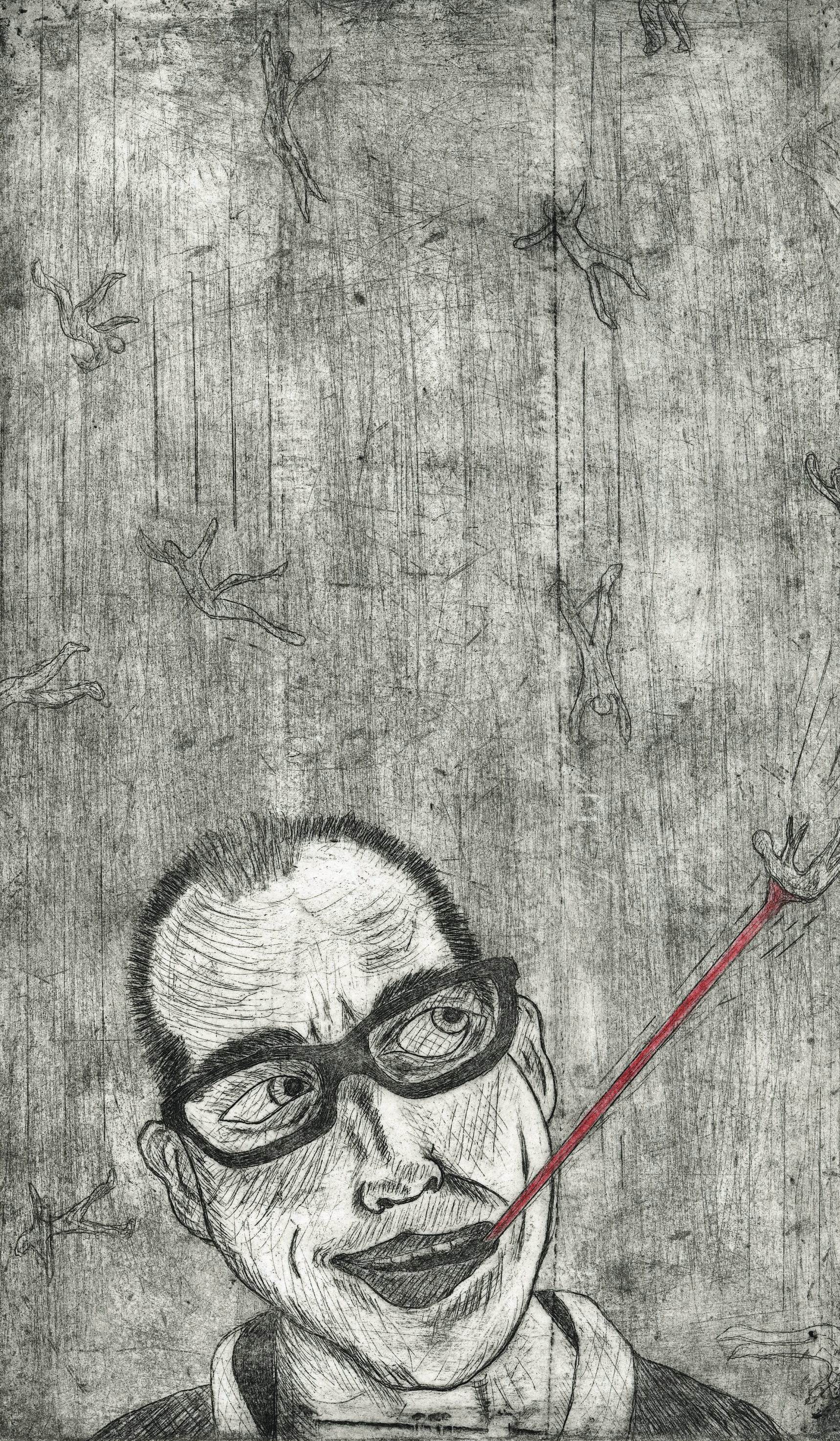 I Wear This Crown of Horns (from The Selfie Series), etching with hand coloring, 6″ x 14″, 2014
