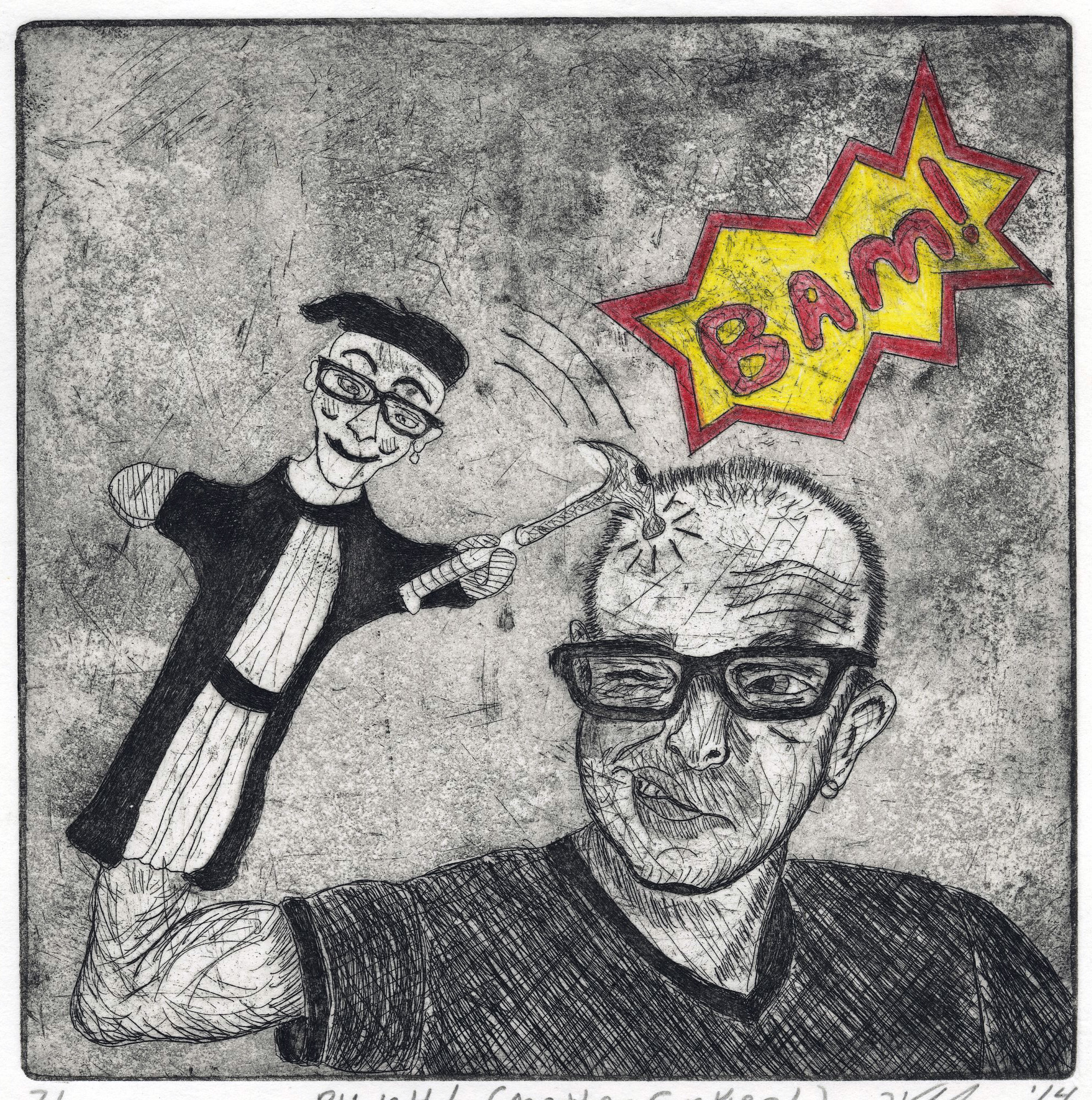 Bam! (from The Selfie Series), etching with hand coloring, 5″ x 5″, 2014