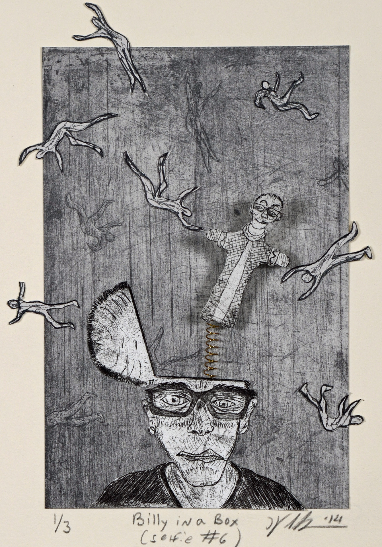Billy in a Box, etching with hand collage, 4.5″ x 4.5″, 2014