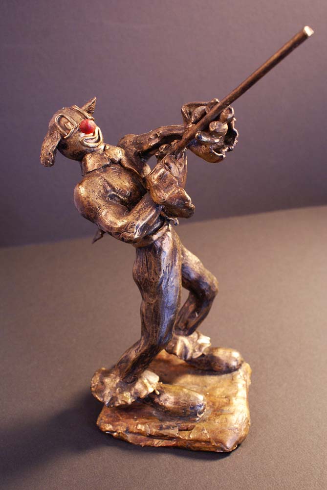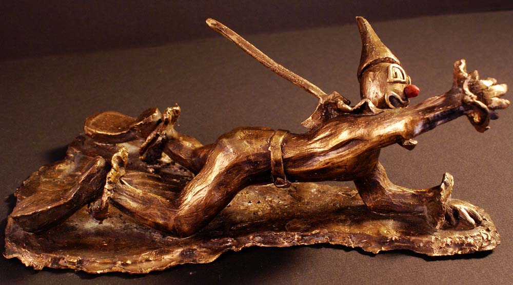 The Clown Genocide: a novel in woodcuts is a story told in forty-two woodblock relief print images and it also includes twelve accompanying bronze sculptures. The artistic intent of this work is threefold. Stylistically, I wanted to create a linear narrative told only in images. The style of the work is inspired by silent films and the works of Frans Masereel and Lynd Ward, whose woodcut novels from the early 20th century are now seen as the precursors to the modern graphic novel. Whereas I looked to these artists for inspiration, I strove to create my own style with my woodcuts and then translated this style into three dimensions with the bronze statues. Conceptually, I wanted to create a world in which I could tell the story of a mythical genocide so that I could challenge the viewer to ask questions about genocide and mass murder without any historical background knowledge. And, intellectually, I wanted to create a work that provokes questions: Why are some groups made the scape-goat for the troubles of society? What is the role of the average person in world events where mass murder is almost a daily news story? What does it mean to be a member of a society that has witnessed such events? And how do people heal from such events?